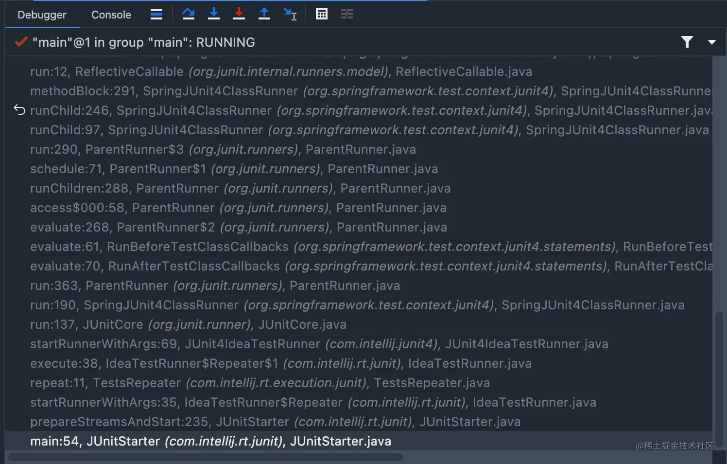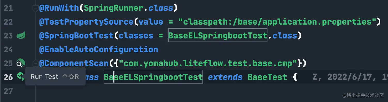 具体的运行机制是:在点下类的Run Test的时候,会去先初始化spring,然后开始运行一个个测试方法,当测试方法运行的时候,如果发现没有初始化spring,还会初始化一遍spring。这就解释了,当我们单独运行方法的run test的时候,也会初始化一遍spring。