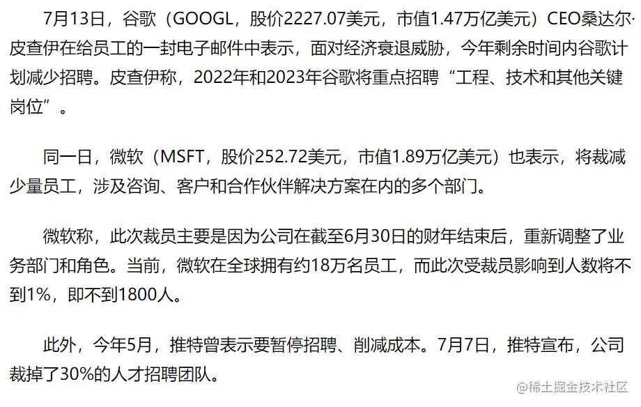 国内的大家都很熟悉了,腾讯、阿里、美团、字节、滴滴等等众多大厂都进行了不同程度的裁员,国外的苹果、微软、Google、亚马逊、Meta、特斯拉等也都挺不住了,也开启了各类裁员计划或者停止招聘的计划。
