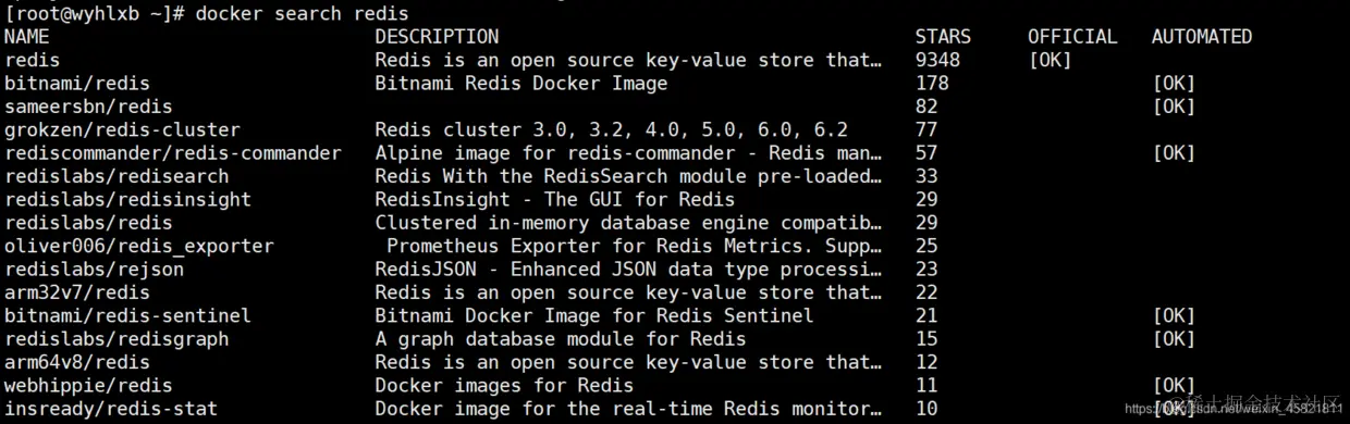 可以看到有很多redis的镜像,此处因没有指定版本,所以下载的就是默认的最新版本 。redis latest.