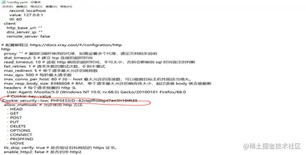 首先我们打开DVWA靶场,挂上代理>>抓包>>将DVWA登陆页面的数据包中的cookie复制到我们的Xray扫描工具的配置文件中;