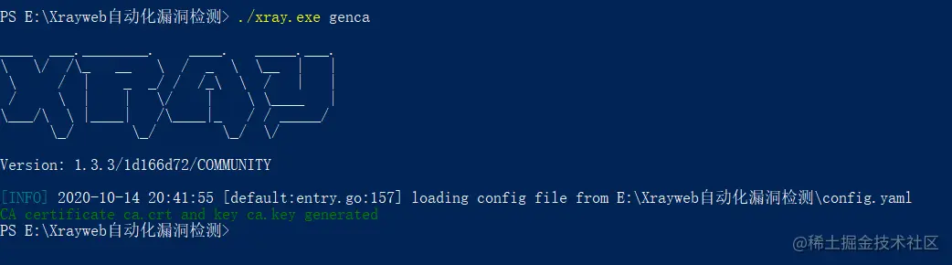 运行 ./xray.exe genca 命令生成证书文件; 进入xray目录下,双击安装证书ca.crt;