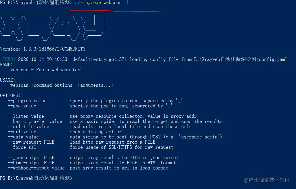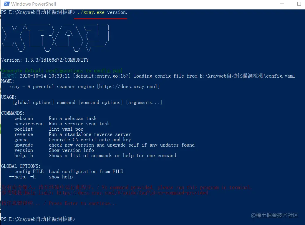 注意:以powershell执行时,命令为./xray.exe; 以cmd运行时,命令为xray.exe