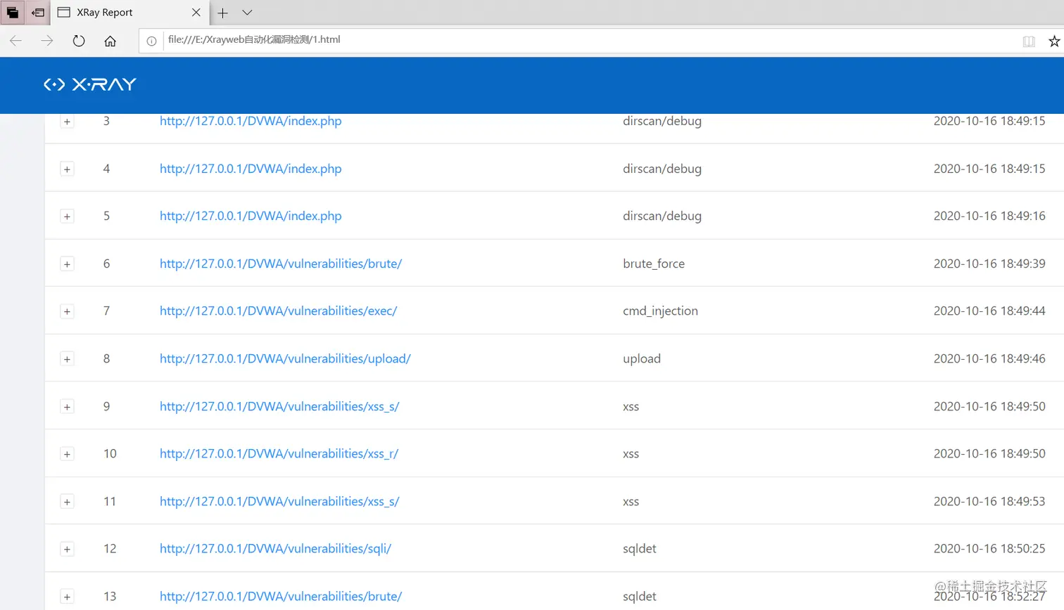 检测结果输出到我们定义的html格式文件中:(可以看到扫描出了DVWA靶场中暴力破解,文件上传,sql注入,xss,命令行注入等等漏洞)