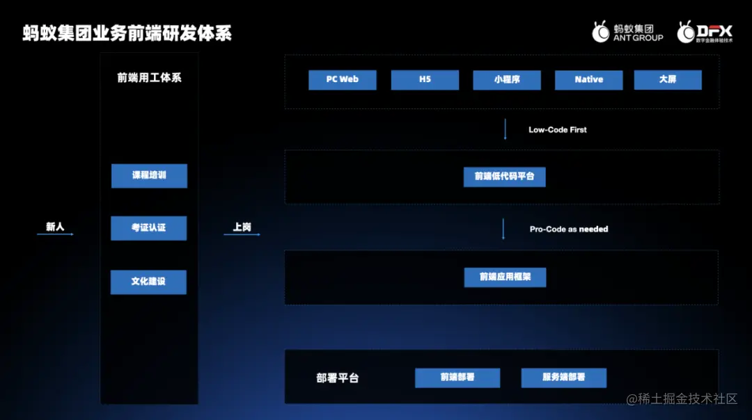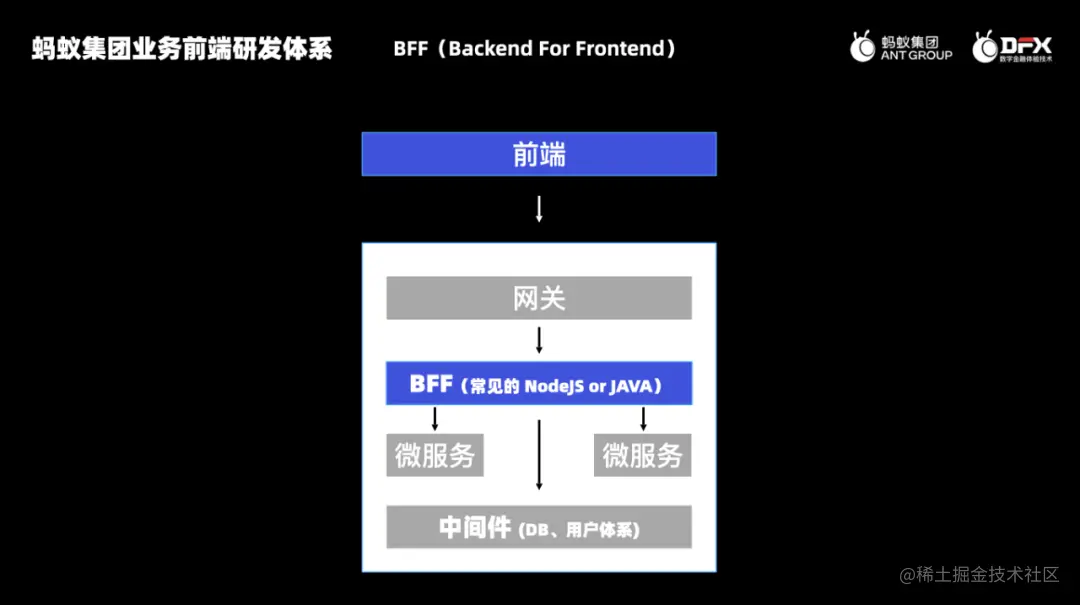 在业务上首选前端低码平台,其次是前端应用框架。图下面可以看到有一块是服务端部署,在蚂蚁或者阿里内部,BFF 是前端的一个特点。那么什么是 BFF 呢?
