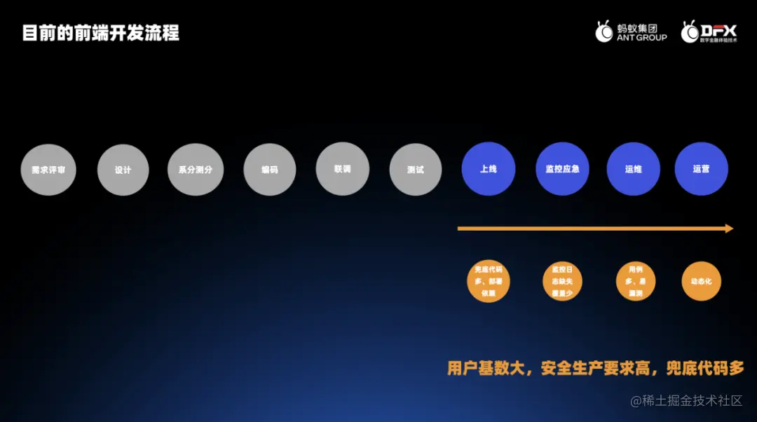 最后看一下上线阶段。我们的用户基数大,对安全生产的要求高,带来的问题就是兜底代码多。这个兜底代码是什么呢?比如,如果某一天有个接口或者依赖挂了,我要有监控能主动感知到前端报错了,我们的页面不能直接崩溃,我们会有缓存、重试、降级等等方案来最大限度保证体验。在小公司我一个需求可能3天就搞完上线了,但是在蚂蚁,同样一个需求,我要花5天甚至6天,这多出来的时间就是在搞降级、监控等。