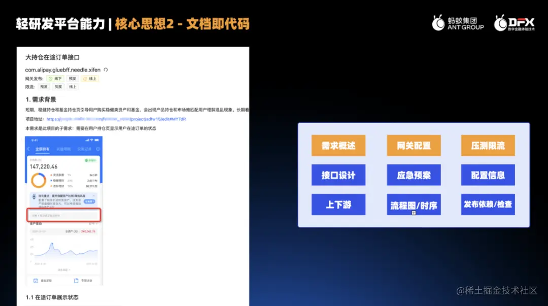上面这张图演示了文档即代码,可以看到,在我们的研发体系化环境中,需求、视觉、网关配置、接口设计等等各种相关的文档集中在一起,你不需要在各个独立的文档中来回切换。一个小的需求变更,我们顺手就改掉了各个相关的地方。