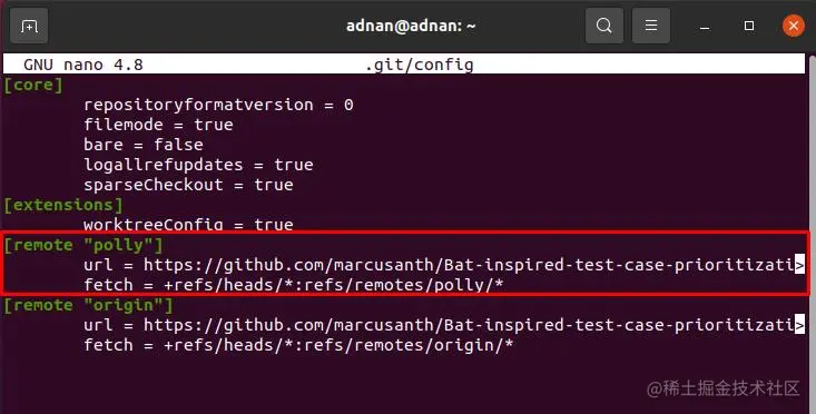 在这里,你会注意到远程名称;在本例中,有两个远程被命名为 "polly"和 "origin";你必须删除你想删除的远程的配置行:例如,我们想删除 "polly";所以我们必须从配置文件中删除 "polly"远程的配置;与 "polly"远程相关的设置显示在下图中;只要选择这些行并删除它们。