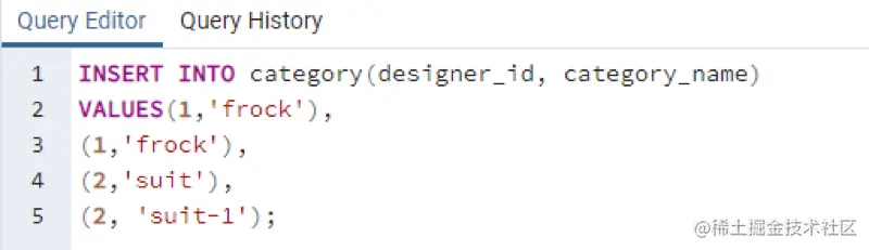 >> insert into category(designer_id, category_name) VALUES (1, ‘frock’), (1, ‘frock’), (2, ‘suit’),(2, ‘suit-1’);