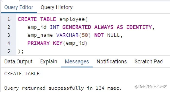 >> CREATE TABLE employee ( emo_id GENERATED ALWAYS AS IDENTITY, emp_name VARCHAR(50) NOT NULL, PRIMARY KEY(emp_id) );