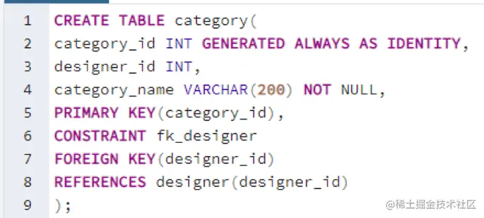 >> create table category(category_id INT GENERATED ALWAYS AS IDENTITY, designer_id INT, category_id INT, category_name VARCHAR(200) NOT NULL, PRIMARY KEY(category_id), CONSTRAINT fk_designer FOREIGN KEY(designer_id) REFERENCES designer(designer_id))<strong>;</strong>