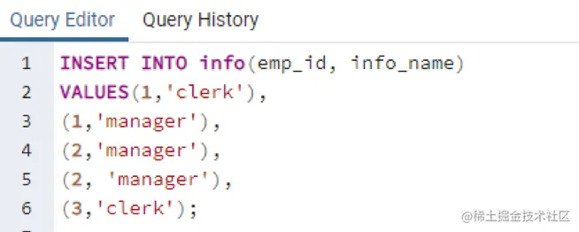 >> insert into info (emp_id, info_name) VALUES ( 1, ‘clerk’), (1, ‘manager’), (2, ‘manager’), (3, ‘clerk’);