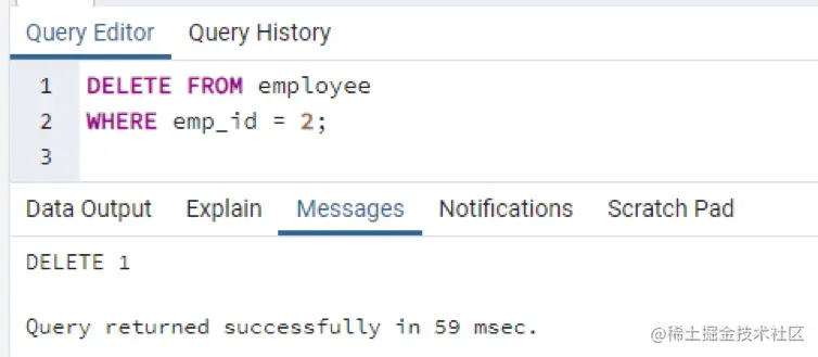 删除命令由 "where "子句组成,用来确定表employee中要删除的行的id。