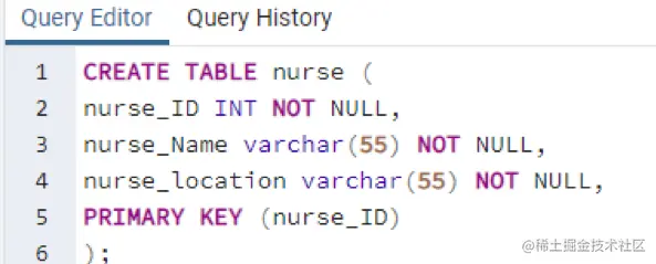>> create table nurse ( nurse_id int NOT NULL, nurse_name VARCHAR(55) NOT NULL, nurse_location VARCHAR (55) NOT NULL, PRIMARY KEY (nurse_ID) );