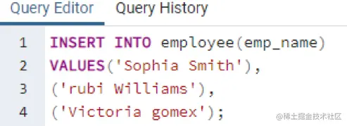 >> insert into employee (emp_name) Values (‘sophia smith’), ( ‘rubi williams’), (‘victoria gomex’);