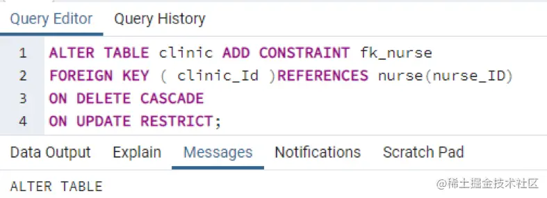 >> ALTER TABLE clinic ADD CONSTRAINT fk_nurse FOREIGN KEY (clinic_Id) REFERENCES nurse (nurse_ID) ON DELETE CASCADE ON UPDATE RESTRICT;