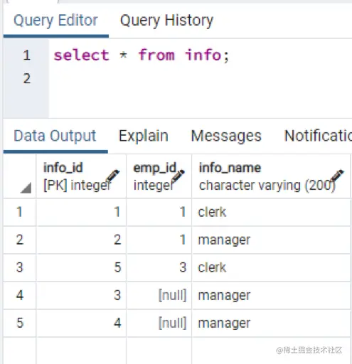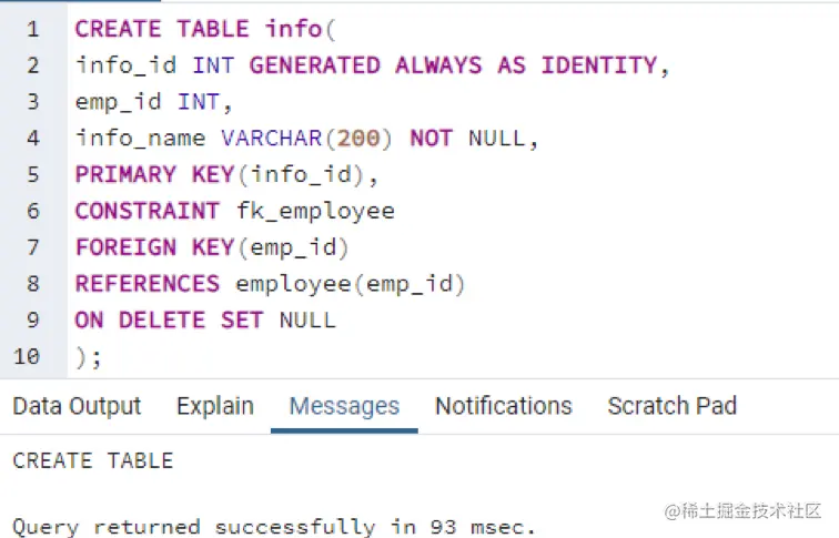 >> create table info (info_id INT GENERATED ALWAYS AS IDENTITY, info_id INT, emp_id INT, info_name VARCHAR(200) NOT NULL, PRIMARY KEY(info_id), CONSTRAINT fk_employee FOREIGN KEY(emp_id) REFERENCES employee(emp_id) ON DELETE SET NULL);