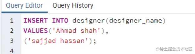 >> insert into designer(designer_name) VALUES (‘Ahmad shah’), (‘Sajjad hassan’);