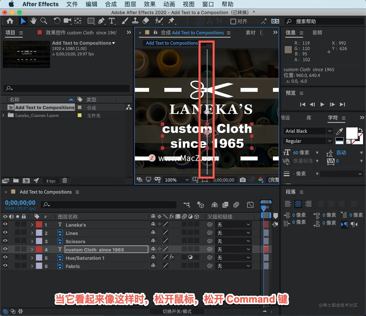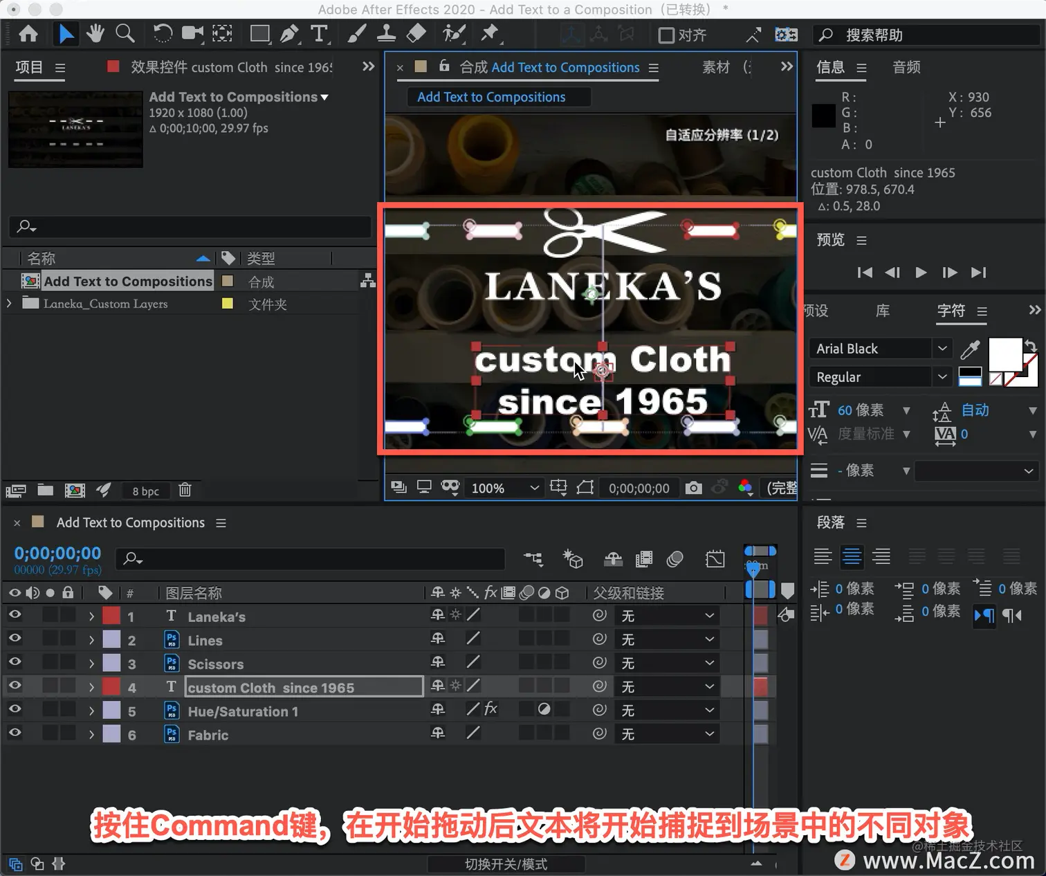 要在构图中重新定位文本,只需在边界框内单击并开始移动文本。按住 Command 键,在开始拖动后文本将开始捕捉到场景中的不同对象。松开鼠标和控制键,把鼠标右移到单词的中间部分。