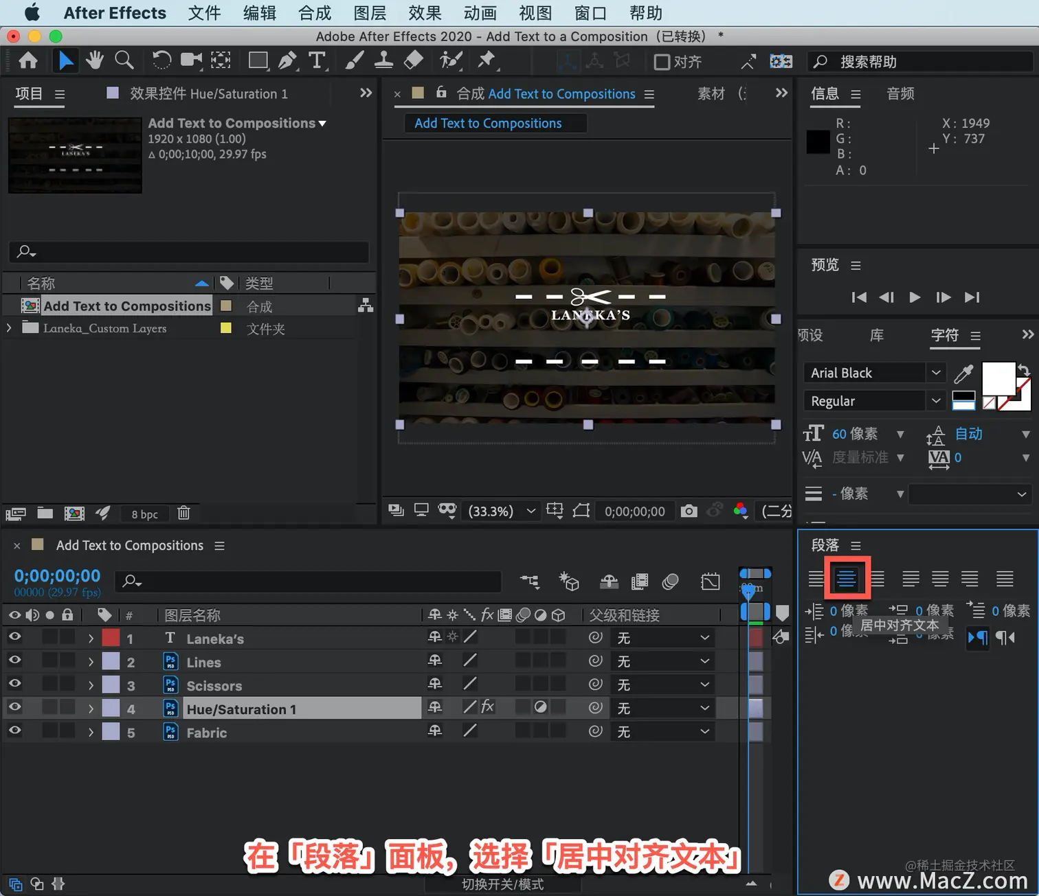 在「段落」面板,选择「居中对齐文本」,确保文本位于合成面板中主文本的下方居中。