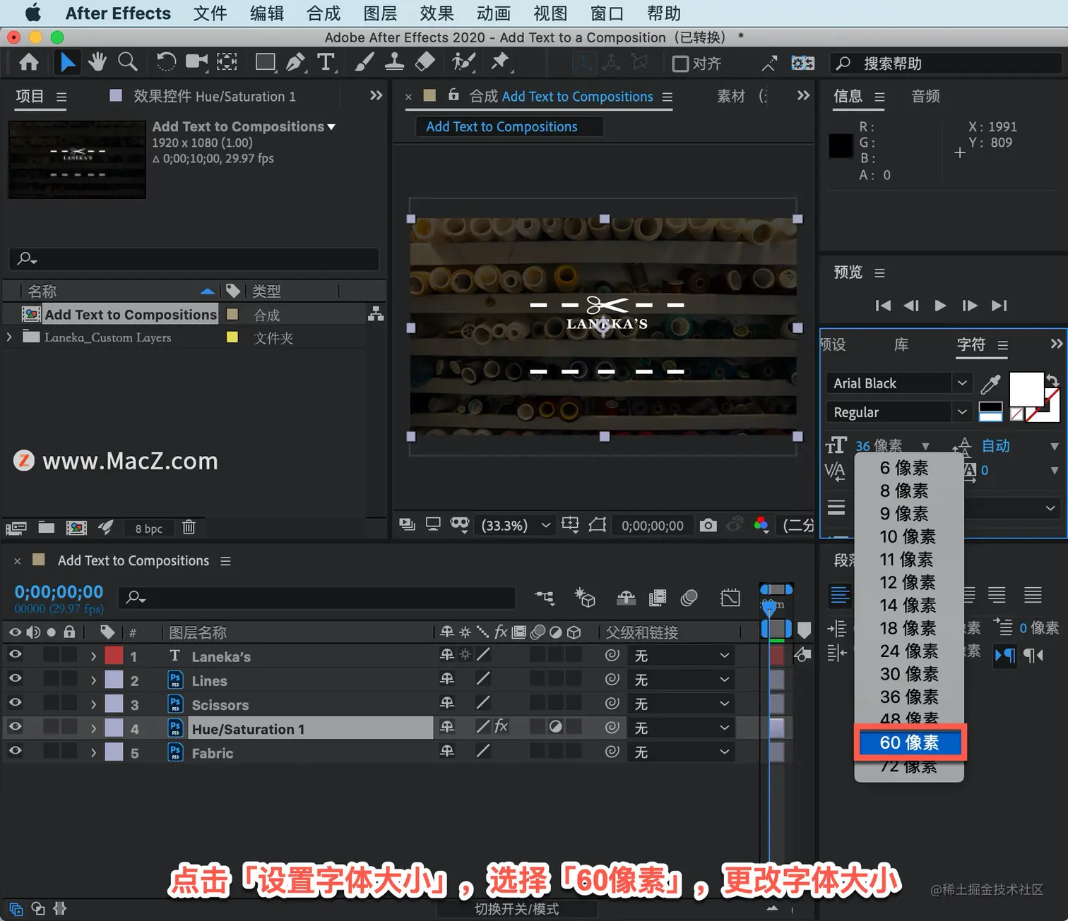点击「设置字体大小」,选择「60像素」,更改字体大小。