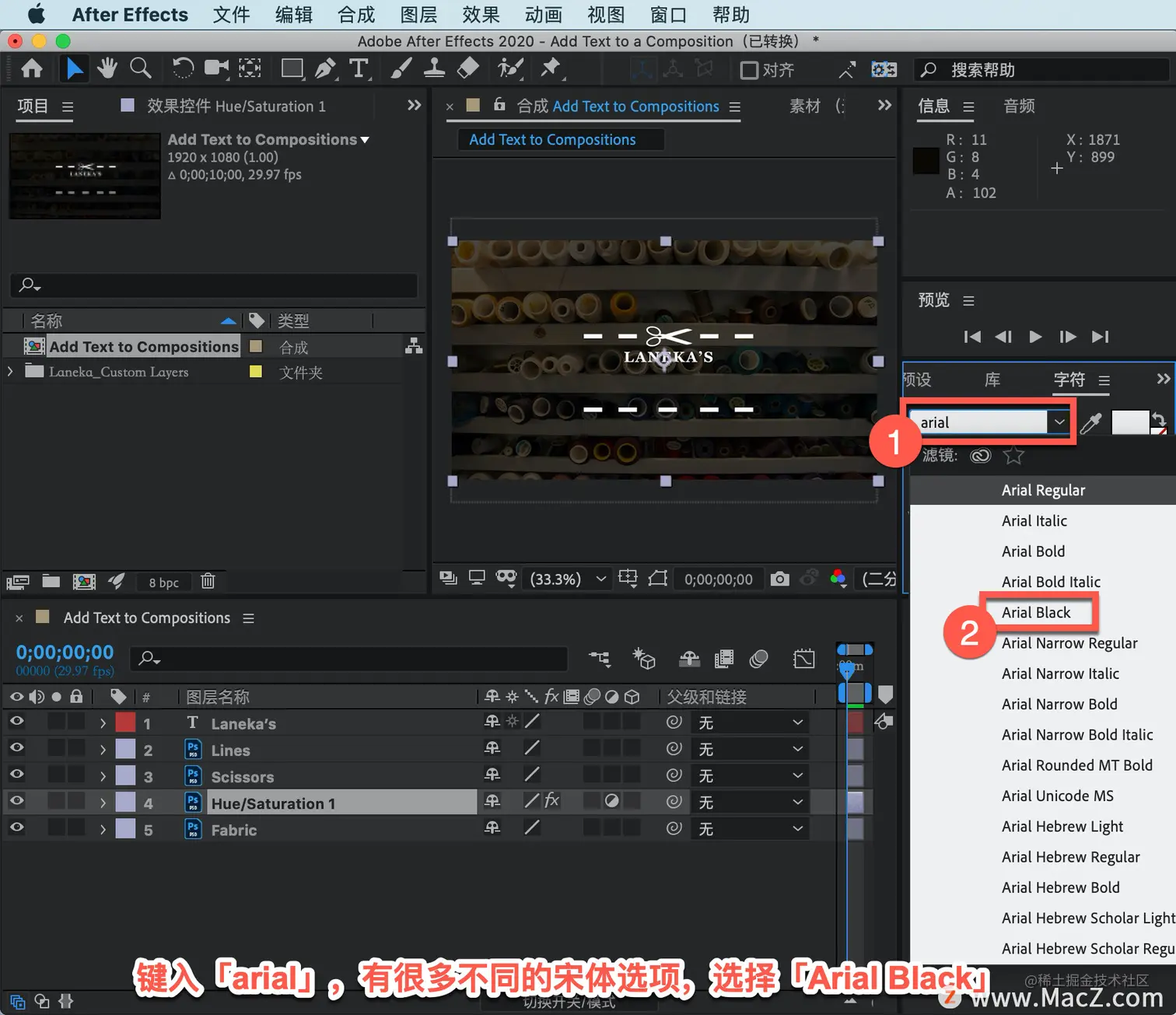 选择 Arial 作为字体,键入「arial」,有很多不同的宋体选项,选择「Arial Black」。