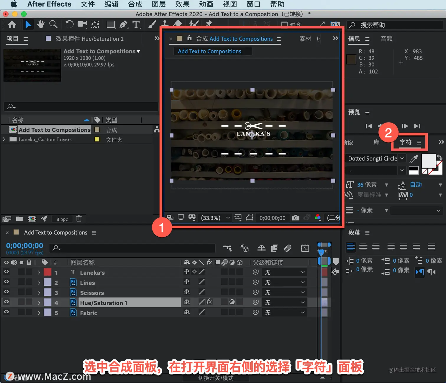 处理文本从切换到文本工作区开始,选中合成面板,在打开界面右侧的选择「字符」面板。