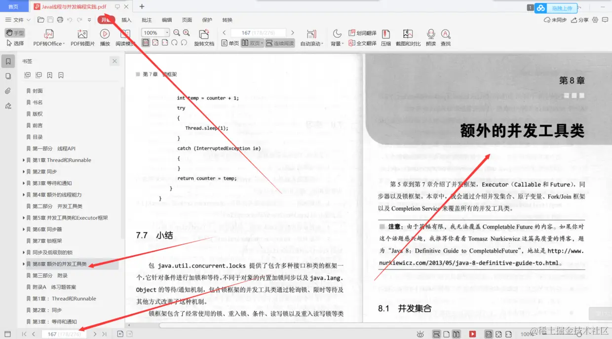 最后,第8章介绍了额外的并发工具,这部分内容在第5章到第7章没有涵盖。这章特别介绍了并发集合、原子变量、Fork/Join 框架以及completion service。