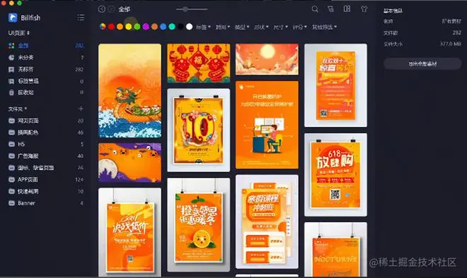 这是一款素材管理工具,它能够帮助我们轻松收集和整理在设计过程中使用到的图片,视频音频等素材,就算你的素材文件很多,Billfish也可以快速定位帮你查到。