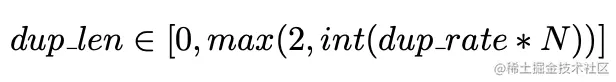 首先给出一个dup_rate(超参数),dup_rate * 文本的长度: 代表最多能选多少个token进行重复。最少选2个token进行重复。具体选多少,是从中随机选一个数字,如下式: