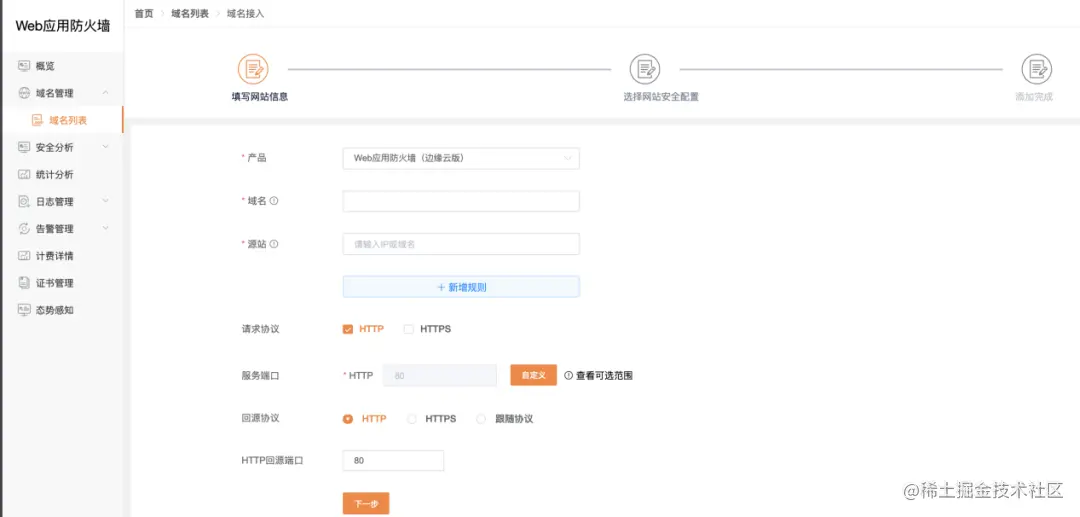 第三步,根据您的需求,填写完域名的源站信息、请求协议、服务端口、回源协议和回源端口等信息,点击【下一步】填写域名安全配置页面;