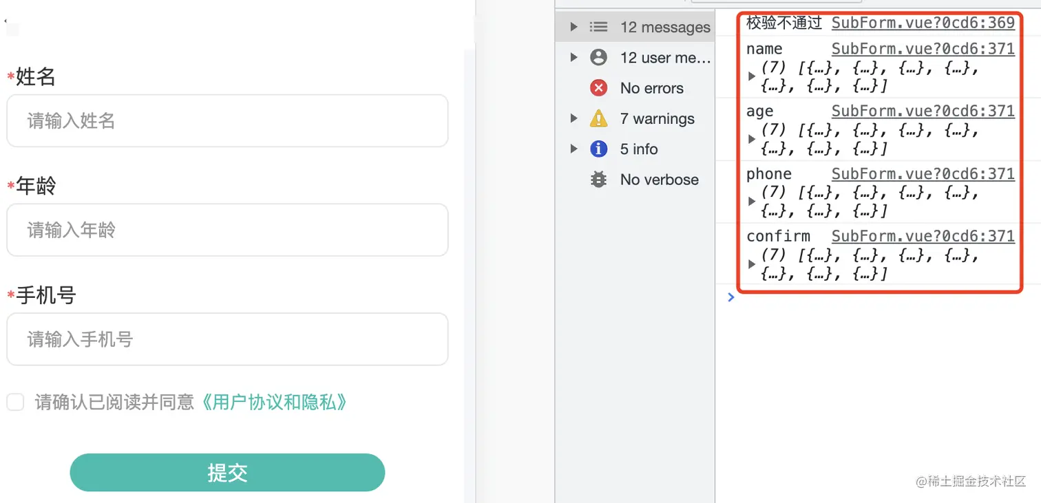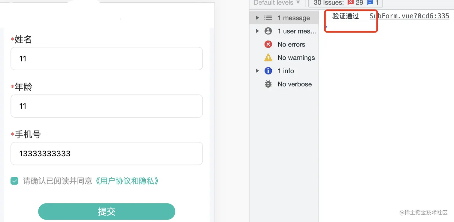 符合验证规则,点击提交,控制台显示验证通过