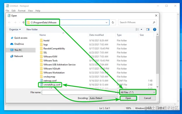 导航到C:\ProgramData\VMware目录,从下拉菜单中选择所有文件(*.*),选择文件vmnetdhcp.conf,并点击打开 ,如下图所示。