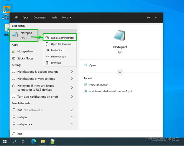 现在,搜索记事本 应用程序,右击(RMB),点击以管理员身份运行,如下图所示。