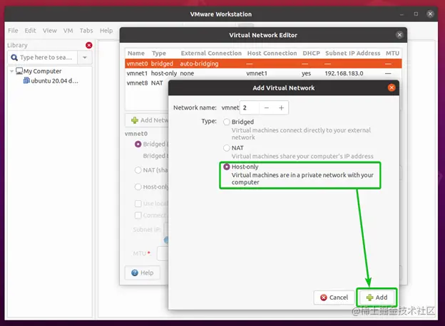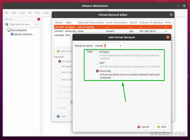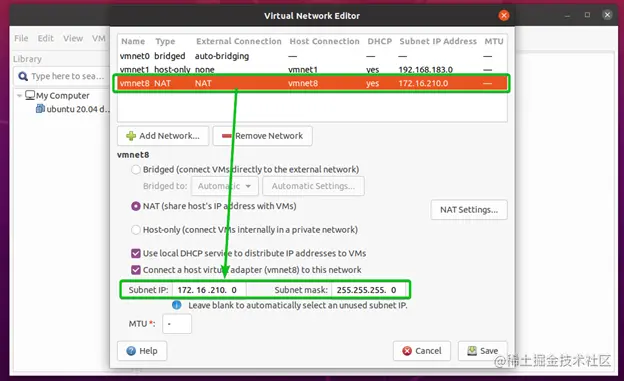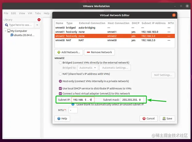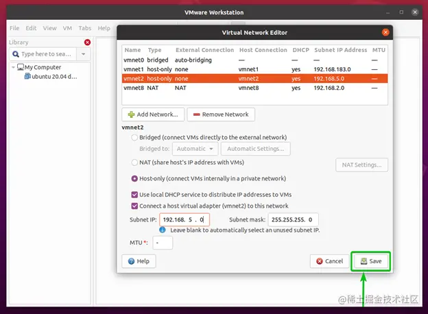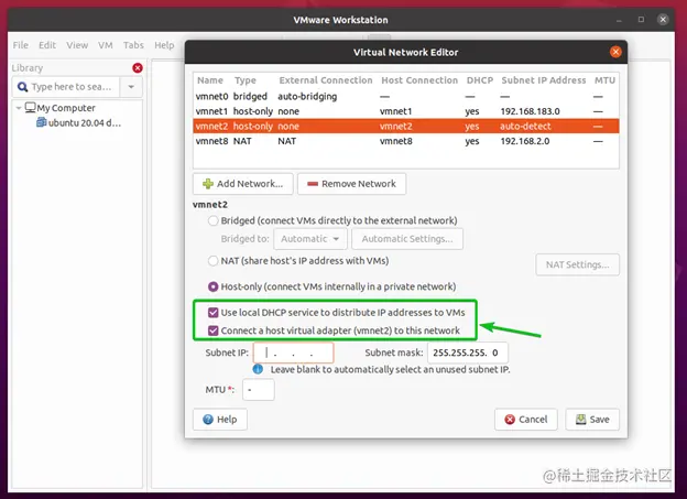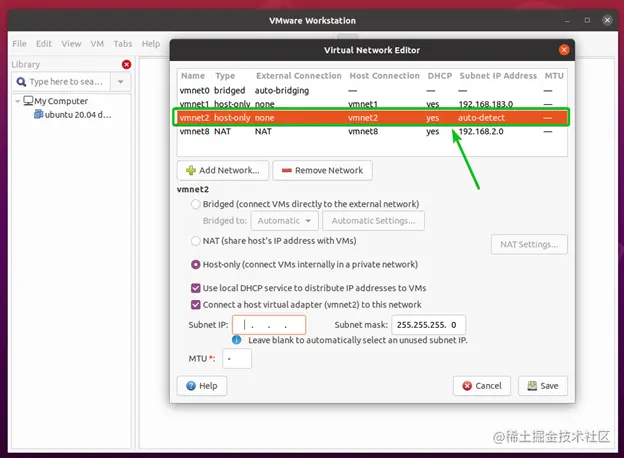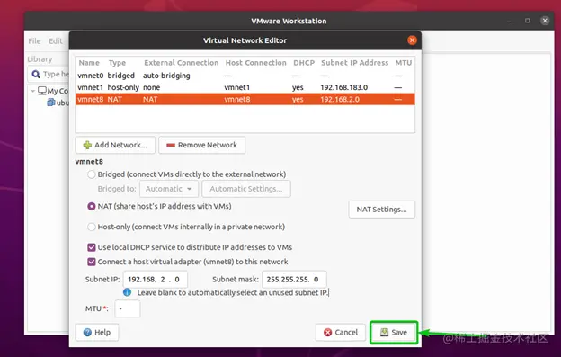 另外,确保勾选将主机虚拟适配器(vmnet*)连接到该网络的复选框。否则,你将无法从主机访问虚拟机。