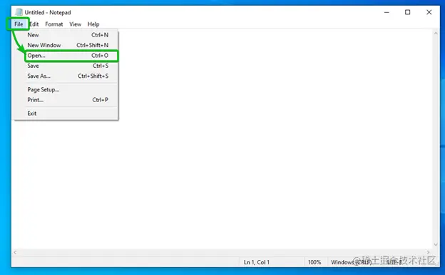 记事本 应用程序应该被打开。点击 "文件">"打开"。