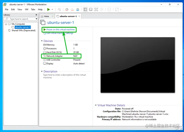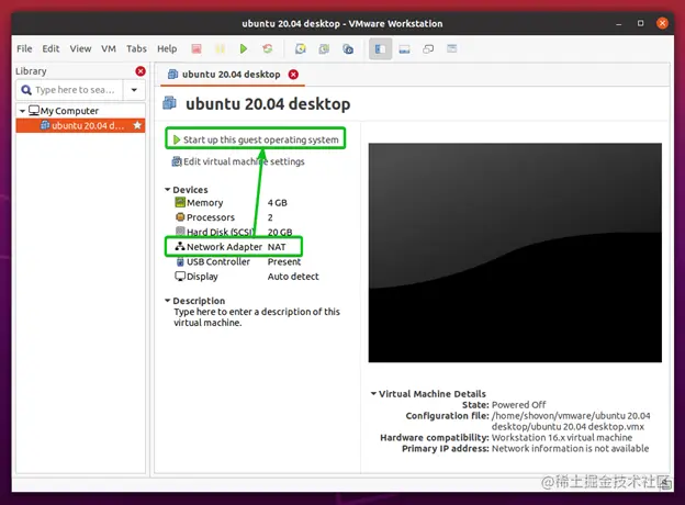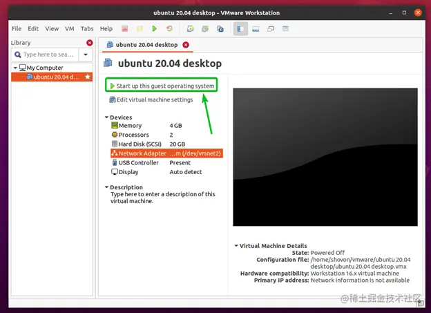 一旦你的计算机启动,打开VMware Workstation Pro 16应用程序。把虚拟机的网络接口改成你刚刚改变了DHCP IP范围的那个,然后启动虚拟机。