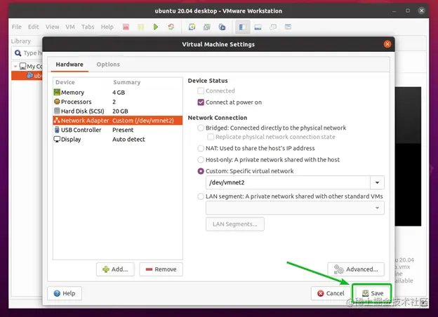 现在,把你想要的虚拟机的网络适配器改为新创建的网络适配器(在我的例子中是vmnet2 )。