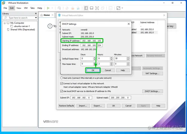 在Windows操作系统上,你可以从虚拟网络编辑器窗口中改变任何VMware Workstation Pro 16网络接口的DHCP IP范围。