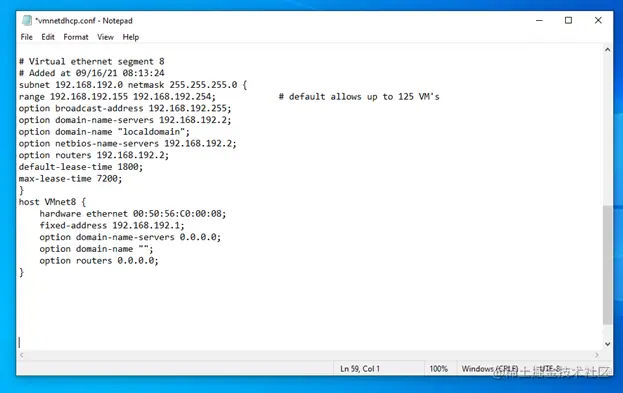 由于虚拟机使用的是默认的NAT网络接口vmnet8,要编辑的配置文件是**/etc/vmware/vmnet8/dhcpd/dhcpd.conf。**