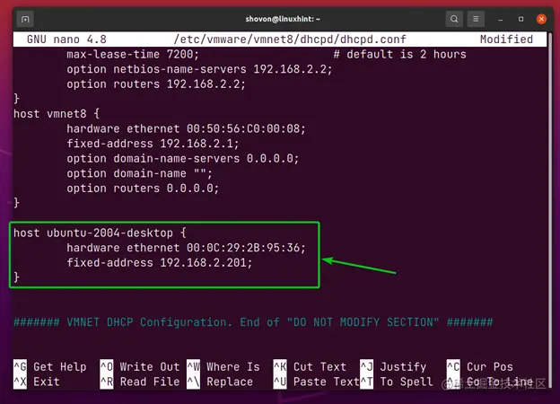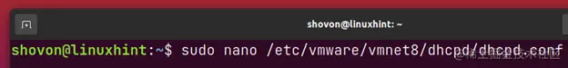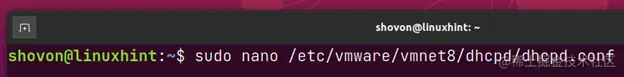 $ sudo nano /etc/vmware/vmnet8/dhcpd/dhcpd.conf