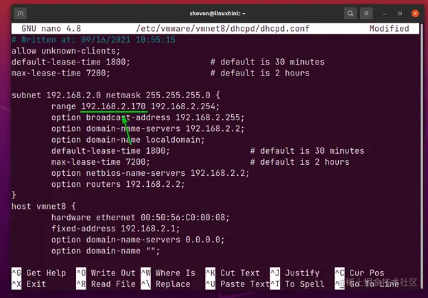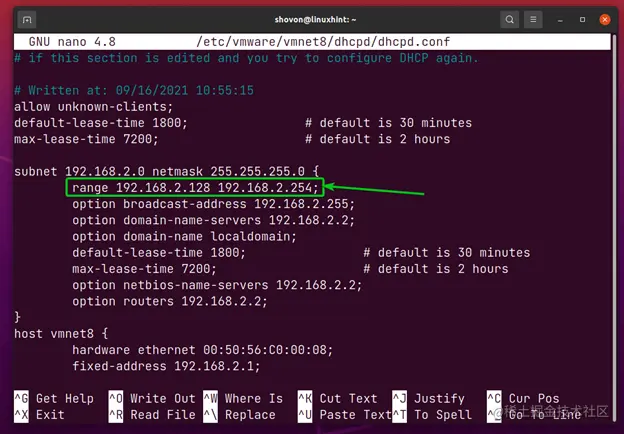在**/etc/vmware/vmnet8/dhcpd/dhcpd.conf**文件中,你应该找到下面截图中标明的以关键字range开头的一行。这是你应该修改的一行,以改变该网络接口的DHCP IP范围。