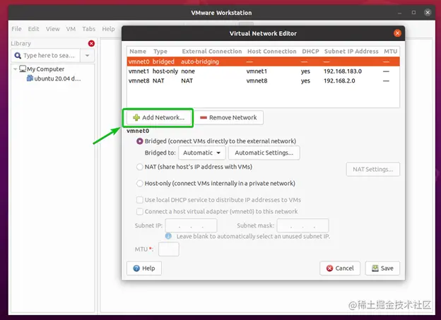 要创建一个新的网络接口,在虚拟网络编辑器窗口中点击添加网络...。