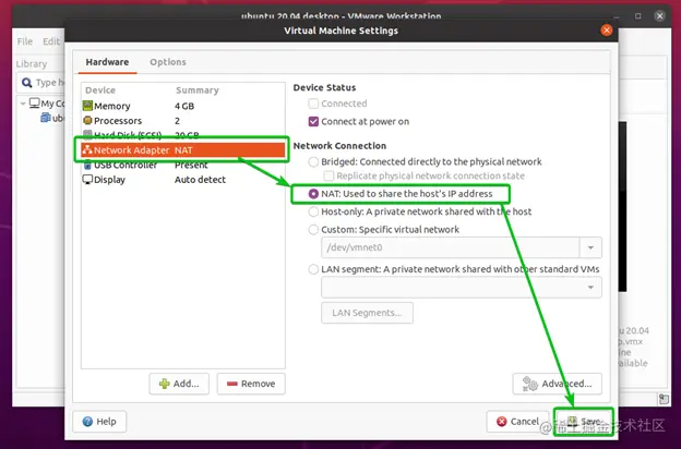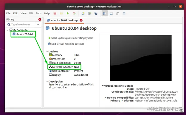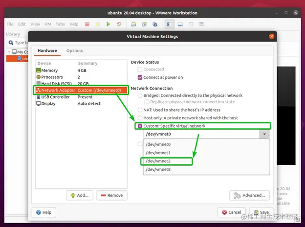 在虚拟机设置窗口中点击硬件>网络适配器。该虚拟机正在使用默认的NAT 网络接口。默认的NAT网络接口在Linux上被称为vmnet8 。