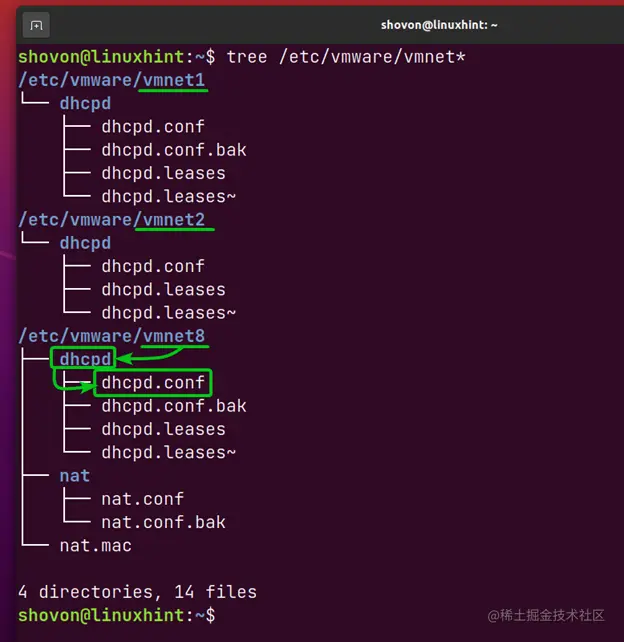 正如你所看到的,VMware Workstation Pro 16的每个网络接口都在自己的目录中(即/etc/vmware/vmnet1,/etc/vmware/vmnet8)。在每个目录中,你都有一个dhcpd/目录,而在dhcpd/目录中,有一个dhcpd.conf文件。