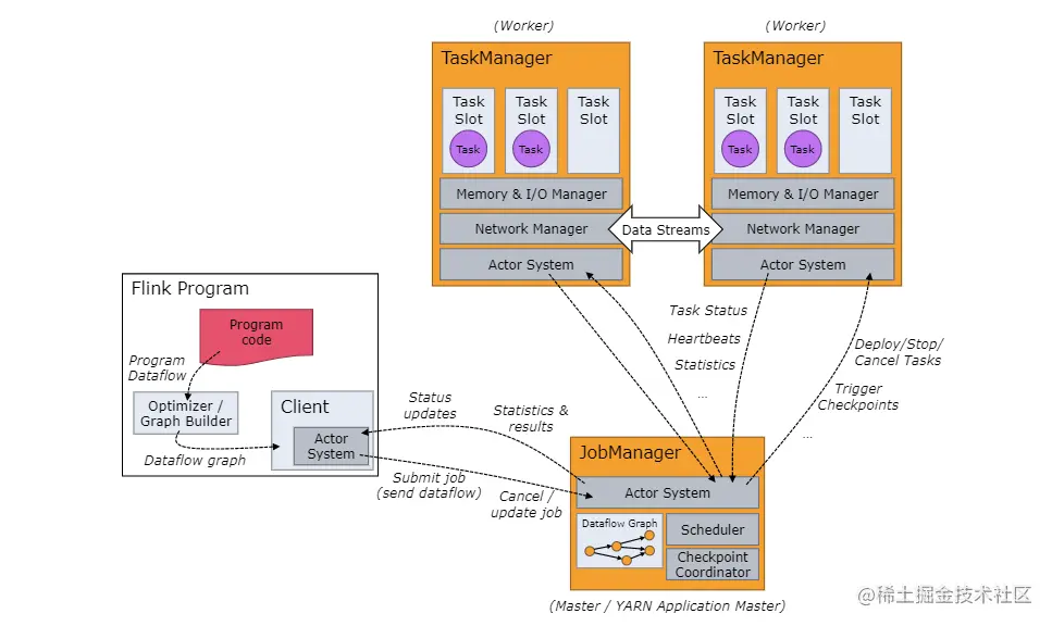 🚩TaskManager(TM):负责执行一个DataFlow Graph的各个task以及data streams的buffer和数据交换。