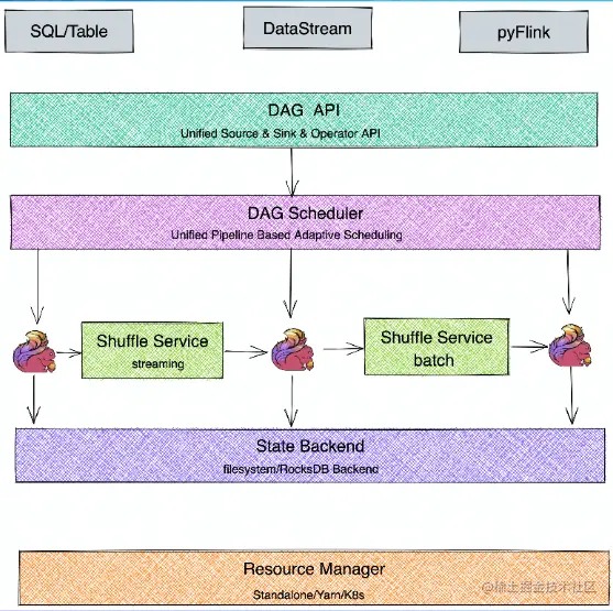 **🚩执行引擎层(Runtime层):执行引擎层提供了统一的DAG,用来描述数据处理的Pipeline,不管是流还是批,都会转化为DAG图,调度层再把DAG转化成分布式环境下的Task,Task之间通过Shuffle传输数据;