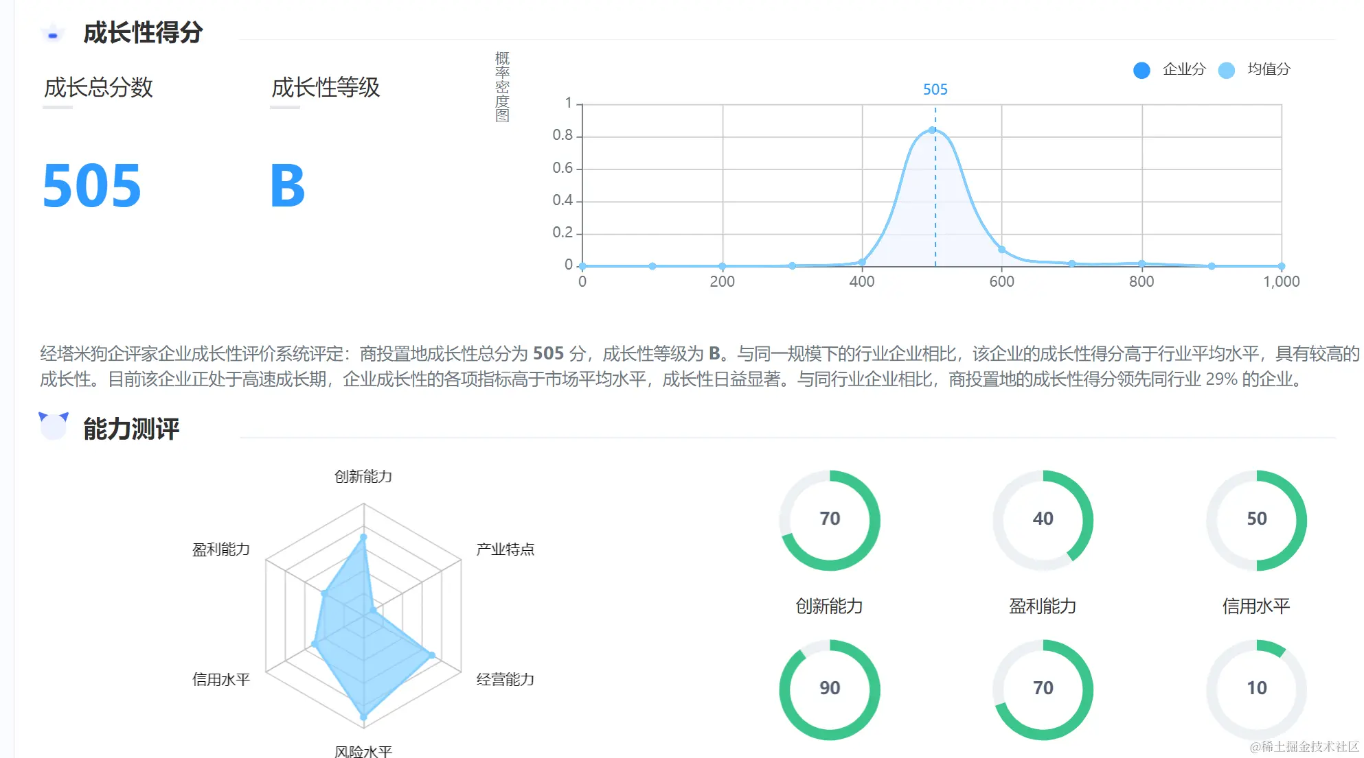 经塔米狗企评家企业成长性评价系统评定:商投置地成长性总分为 505 分,成长性等级为 B。与同一规模下的行业企业相比,该企业的成长性得分高于行业平均水平,具有较高的成长性。目前该企业正处于高速成长期,企业成长性的各项指标高于市场平均水平,成长性日益显著。与同行业企业相比,商投置地的成长性得分领先同行业 29% 的企业。
