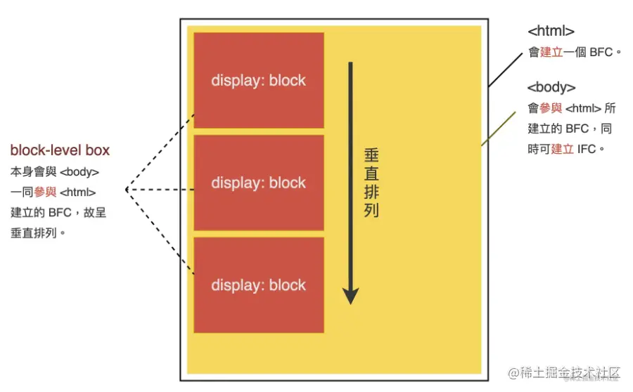 - IFC 的形成条件非常简单,块级元素中仅包含内联级别元素,需要注意的是当IFC中有块级元素插入时,会产生两个匿名块将父元素分割开来,产生两个 IFC。