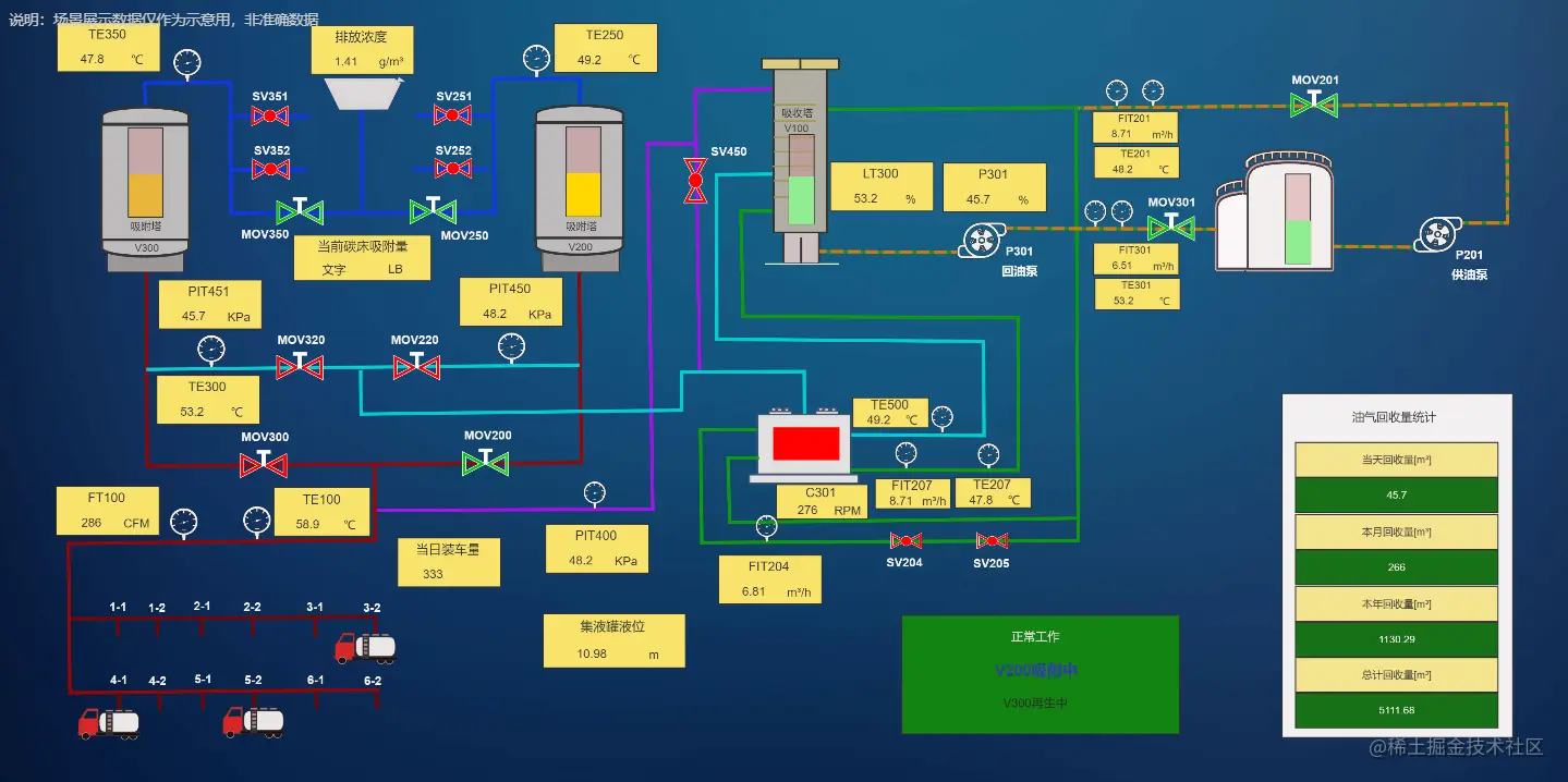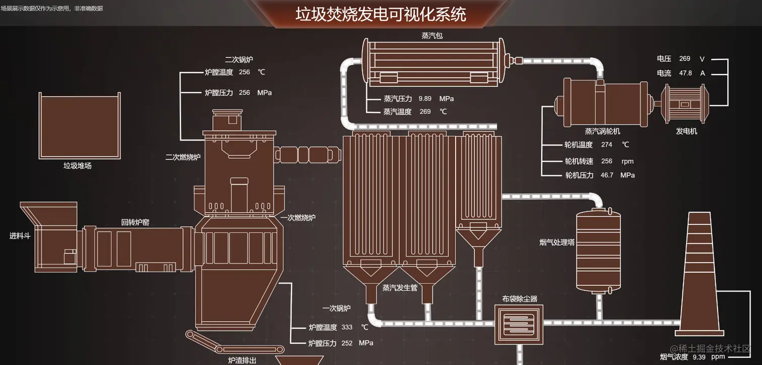 Sovit2D 运用 2D 组态图的方式科普垃圾发电的工作原理,管理人员能够更直观看到各系统的工作状态、检测信息,包括垃圾仓发酵时长,垃圾仓负压、烟气炉膛停留时间温度、DCS 炉膛温度,汽轮机温度等,场景内点击“组态工艺”即可下钻切换。不同维度的数据可视化流程图,满足不同管理运营人员的业务诉求。