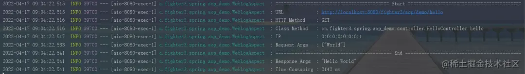 执行结果:可以看到日志打印了入参、出参和执行时间